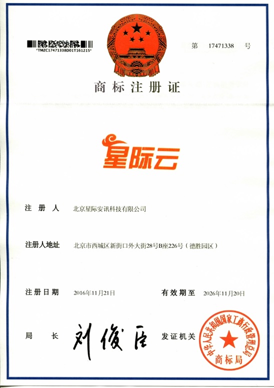 热烈祝贺北京星际安讯科技有限公司自主设计、自行申请注册的“星际云”商标,获得中华人民共和国国家工商行政管理总局商标局核准注册成功,实现公司商标零的突破。