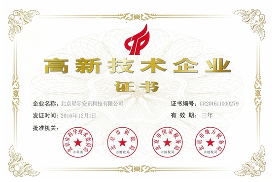 北京星际安讯科技有限公司凭借专业的研发队伍、深厚的技术实力、持续的创新能力、科学的企业管理,经过提交材料、受理、评审、公示、认定、备案等程序,历经3个多月的时间,顺利通过高新技术企业认定,获得由北京市科学技术委员会、北京市财政局、北京市国家税务局、北京市地方税务局联合颁发的“高新技术企业证书”。